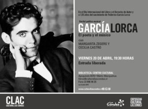 Viernes 20 de abril, 19:30 horas / Biblioteca Centro Cultural Las Condes / Apoquindo 6570 CONCIERTO POÉTICO MUSICAL EN DÍA INTERNACIONAL DEL LIBRO - En la Biblioteca Centro Cultural Las Condes se presentará un recital de la cantante Cecilia Castro y la guitarrista clásica Margarita Zegers, con un repertorio de canciones musicalizadas por García Lorca. En …