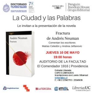 Los esperamos al lanzamiento de «Fractura», de Andrés Neuman. Nos vemos el jueves 10 de mayo a las 19:00 horas. Participan Matías Celedón y Andrea Jeftanovic.